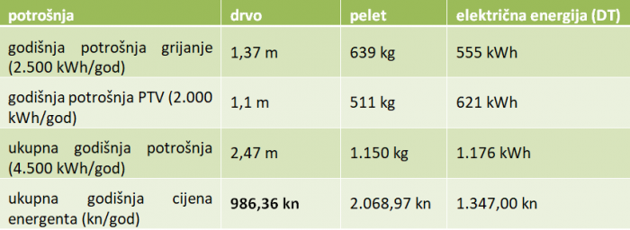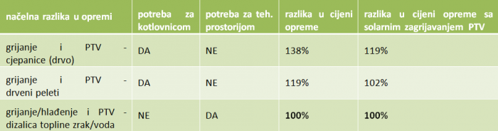 U tablici ispod su prikazane načelne razlike u cijeni opreme (u postocima). Kod kotla na cjepanice u cijenu je uračunat 25 kW pirolitički kotao s lambda sondom BioTec-L 25, zaštita povratnog voda, akumulacijski spremnik CAS 1501, ekspanzijska posuda 150 lit. te kombinirani spremnik PTV SKB Digi 100. U cijenu pelet kotla je uzet 12 kW kotao s lambda sondom PelTec-Lambda 12, akumulacijski spremnik CAS-501, ekspanzijska posuda 80 litara i kombinirani spremnik PTV SKB Digi 100. Za grijanje/hlađenje dizalicom topline uzet je Monoblok 9 kW i spremnik PTV s većim izmjenjivačem WP/E 200.