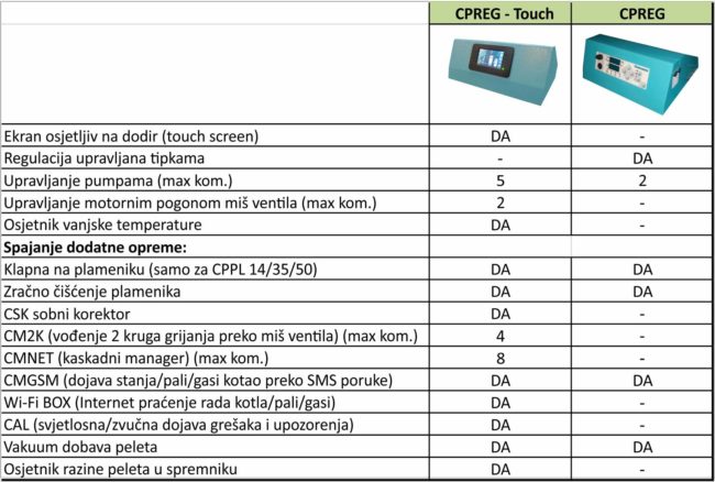 U ponudi je nova regulacija za Cm Pelet-set CPREG-Touch. U nastavku možete vidjeti tablicu usporedbe s dosadašnjom regulacijom CPREG koja je također i dalje u ponudi.