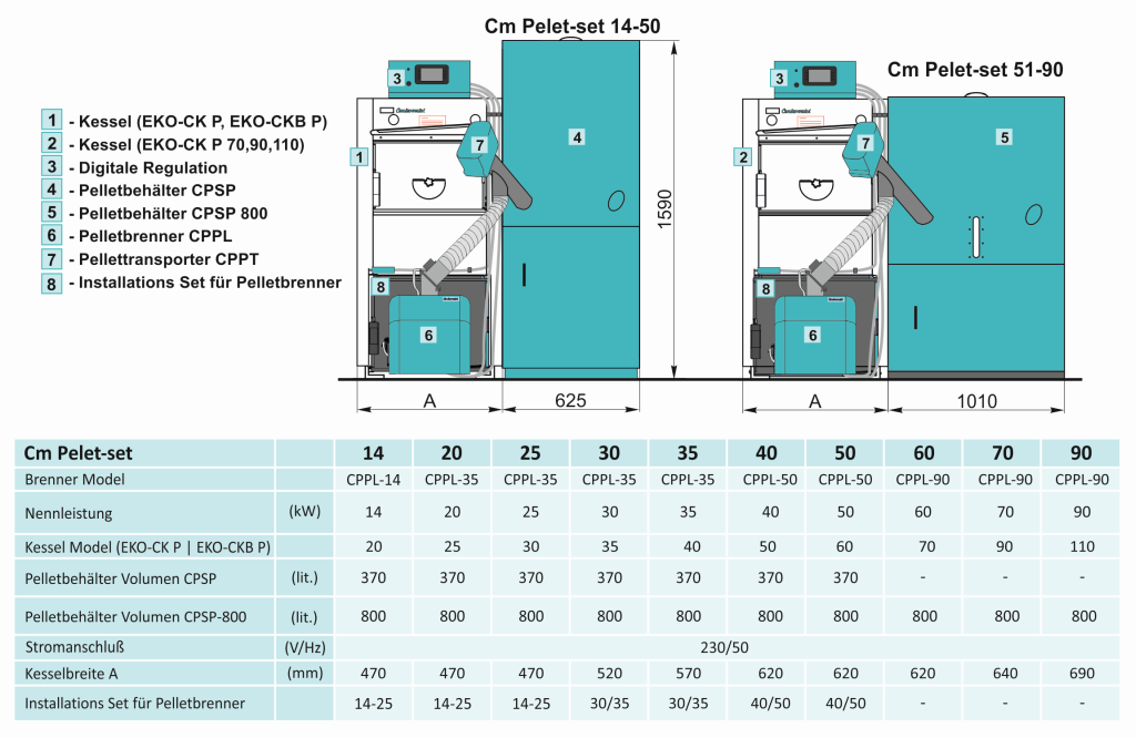 • Das Cm Pelet Set-Touch wird fertig vorbereitet für die Integration mit den Kesseln EKO-CK P (Nennwärmeleistung von 14 – 110 kW), oder EKO-CKB P (Nennwärmeleistung von 14 bis 50 kW).