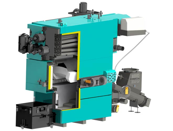 - Isporučuje se zasebno tijelo kotla, ciklon s ventilatorom, kutije za automatsko vađenje pepela, oplata s toplinskom izolacijom, elektro-ormar sa digitalnom kotlovskom regulacijom te pribor za čišćenje što omogućuje jednostavan transport, ugradnju u kotlovnicu te smanjuje rizik od oštećenja.