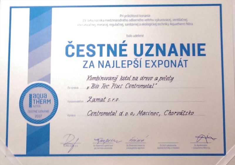 Na sajmu “Aqua Therm” u Nitri (Slovačka) naš novopredstavljeni kotao BioTec Plus primio je priznanje za najbolji eksponat. Izuzetna nam je čast te još jedamput zahvaljujemo organizatoru na priznanju te se zahvaljujemo našem ovlaštenom distributeru za Slovačku, tvrtki “Zamat s.r.o” na dosadašnjoj suradnji.